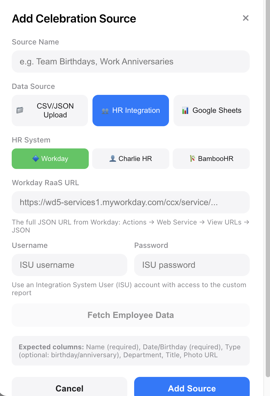 - Enter a Source Name (e.g., “Workday Birthdays & Anniversaries”)